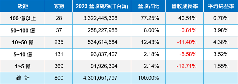檢視本次調查海外台商營收,共可依序分成100億以上、50~100億、10~50億、5~10億、1~5億等五大級距《參見下表一》。50億以上台商合計65家、佔總體樣本8%,其餘92%營收皆位於50億以下,然而這8%台商的營收占比卻超過總體營收八成,從數據顯示海外台商少數營收級距較高群體,具體左右全體海外台商走勢變遷,遭遇景氣逆行格局較具競爭力、維持營收穩定進帳。進一步檢視五大級距各自平均純益率,50億以上級距5.34%較50億以下級距3.14%高出1.7倍,營收級距越高經營效率越完善;同時所有五大級距平均純益率落在1.55~6.70%區間全數維持正數,突顯全級距遭逢逆勢力守獲利,保有盈餘待景氣翻轉逐步量產上攻。