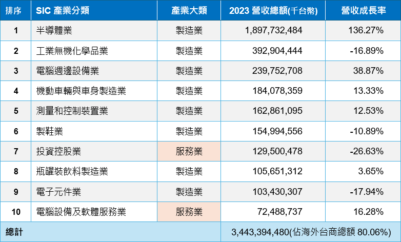 另從海外台商十大產業分類剖析,製造業占比達80%、服務業居20%,製造業分布在半導體業、工業無機化學品業、電腦週邊設備業、機動車輛與車身製造業、測量和控制裝置業、製鞋業、瓶罐裝飲料製造業及電子元件業;而服務業則由投資控股業及電腦設備及軟體服務業進入十大產業排名《參見表三》。這十大產業營收總額合併達3.44兆元超過海外台商年度營收的八成,顯見十大產業對海外台商居舉足輕重地位,就製造業來說傳產及電子各占四項,傳產與電子並肩同行態勢,證明海外台商在百工百業布局樣態廣泛,同時服務業兩強不僅占服務業總體營收近六成,重視資產運作籌資服務科技領航、為科技需求提供系統整合的軟體解決方案等服務業科技化浪潮正在成形,這十大產業佈局亦說明,海外台商正走在機器人及AI智慧化趨勢洪流。