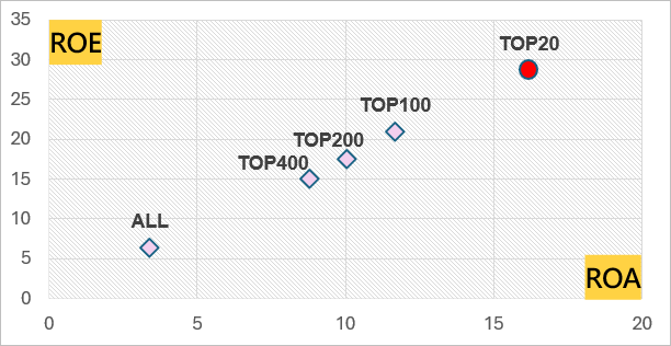 由於調查採計綜合權重排名彰顯海外台商影響力,檢視海外台商排名各級距資產報酬率(ROA)、淨值報酬率(ROE)交叉分布,TOP200平均ROA 9.90%、平均ROE 17.30%,顯示總體排名越趨前列,台商資產運用效率具競爭力、回饋股東能力穩健,說明TOP200組成是本次調查中堅核心、具備劃分總體海外台商影響力的重要分水嶺《參見表四》。