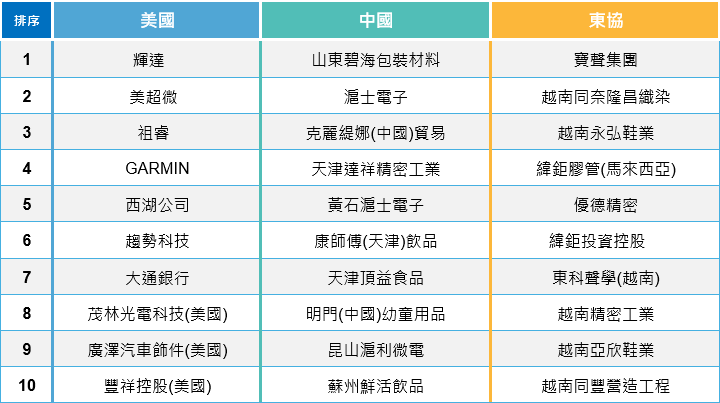 採計綜合權重後的影響力總體排名TOP10,依序為輝達、敏實集團、美超微、祖睿、GARMIN、山東碧海包裝材料、滬士電子昆山、克麗緹娜中國貿易、天津達祥精密工業及黃石滬士電子(名單參見附表)。除卻上述國際知名企業,另從各區域影響力排名領先群觀察,海外台商特殊性依然綻放《參見表七》,例如在美國領先群中,唯一代表金融業領銜入榜的大通銀行,目前在加州洛杉磯及爾灣地區共擁有五家分行,不僅在美西十二州數百家銀行競逐中,榮獲S&P Global認證美西最佳社區銀行,更發布清寒獎學金計劃,幫助家庭清寒高中生進入大學追求夢想,以多元族群服務與在地永續口碑立足美西。