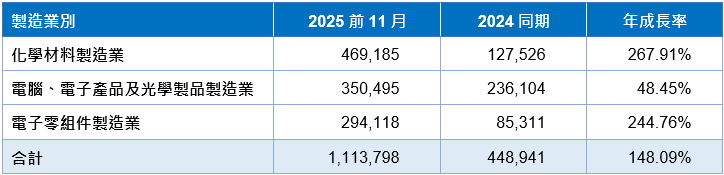 《表二》2025年前11月僑外資對我國製造業投資金額前3大產業成長情況
