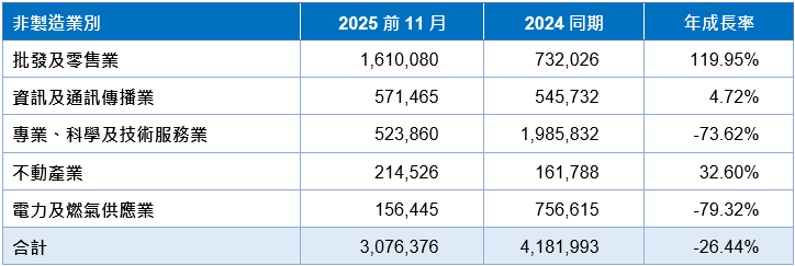 《表三》2025年前11月僑外資對我國非製造業投資金額前5大產業成長情況