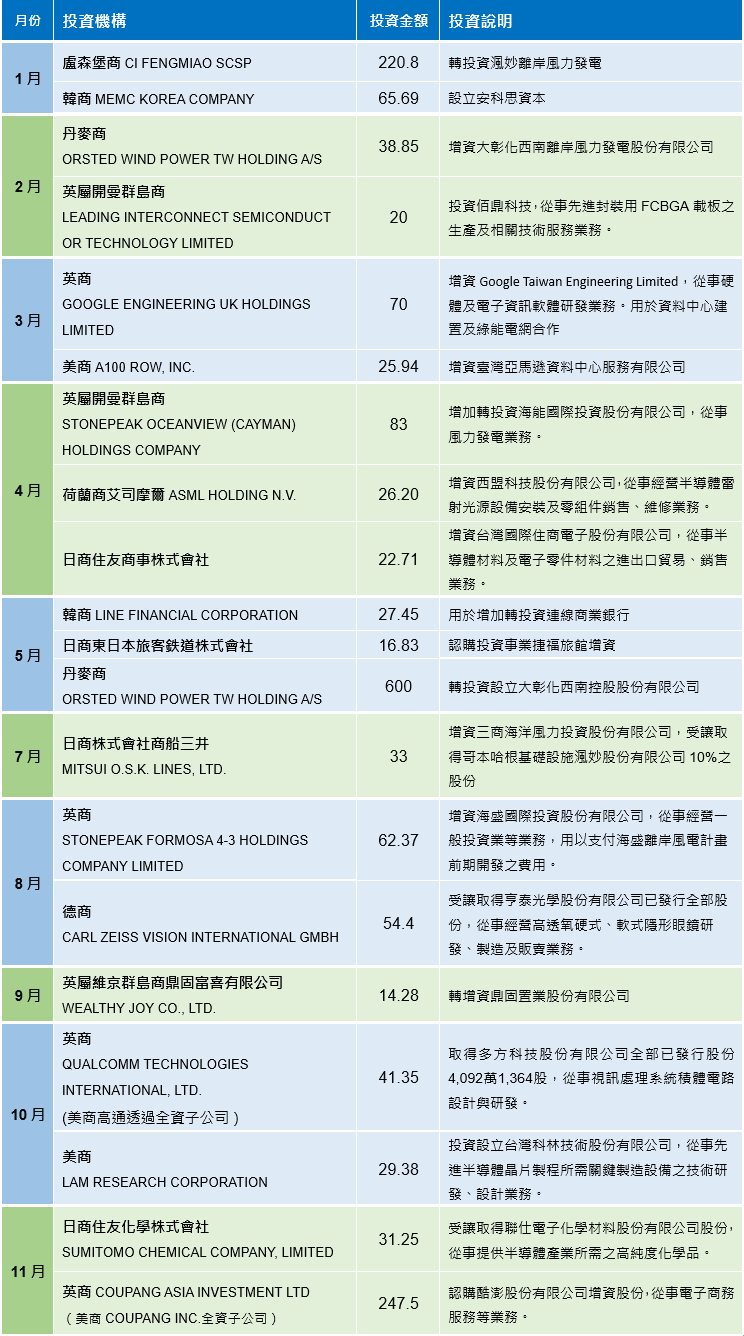 《表四》2025年前11月外資對台灣重要投資案一覽表