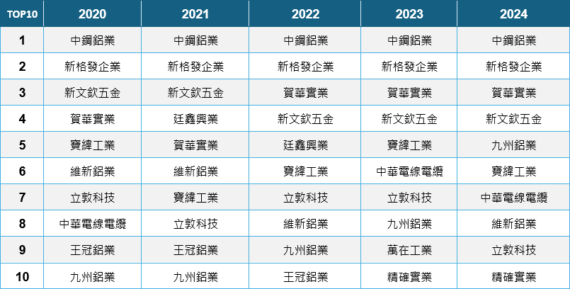 《表一》鋁基本工業及其製品業TOP10業者近5年營收排名