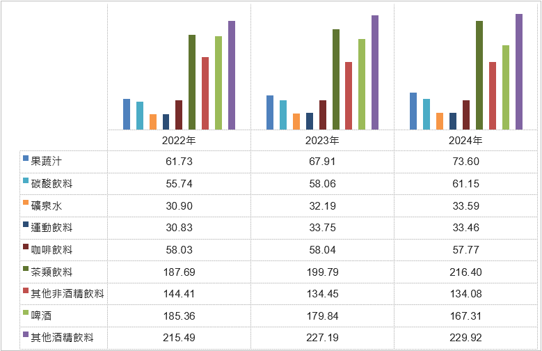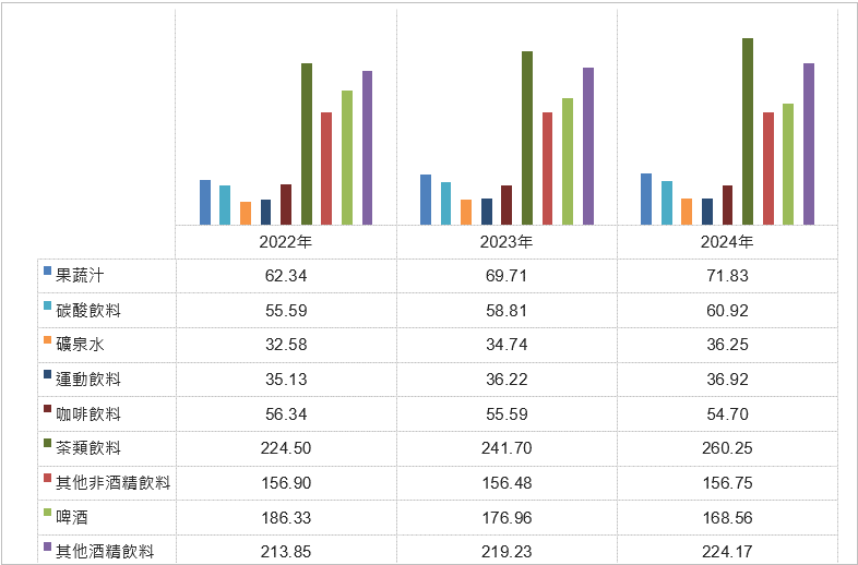 而觀察近三年台灣各類飲品總產值,2024年總產值達新台幣1,007.28億元,較2023年成長1.62%,其中茶類及果蔬汁成長最多,分別增長8.31%及5.28%;啤酒則為飲料中衰退幅度最高,約6.97%《圖二》。而近2024年台灣各類飲品銷售總額為新台幣1,070.35億元較2023年微幅成長1.99%,其中以茶類的7.68%及礦泉水類4.33%增長最多;啤酒類仍為衰退幅度最高者《圖三》。在各類飲品銷售額中茶類銷售額持續居於首位,主要因飲料業者持續研發各種風味且方便飲用的包裝茶飲供消費者選擇。