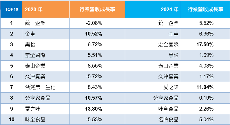 2024年行業營收成長幅度第二高之企業-愛之味,2025年受經濟景氣及通膨影響,全年合併營收較2024年衰退1.58%。另該公司2025年底正式推出「純濃燕麥奶粉」,此舉表示該公司正式打入沖泡粉市場,鎖定高達新台幣50億元之沖泡商機。此外,其長期看好健康飲品市場、植物基市場兩大市場潛力,近年積極規劃布局健康飲品市場,將於大埔美新廠建立先進高速900bpm無菌飲料線,預計年產能達2,400萬打。
