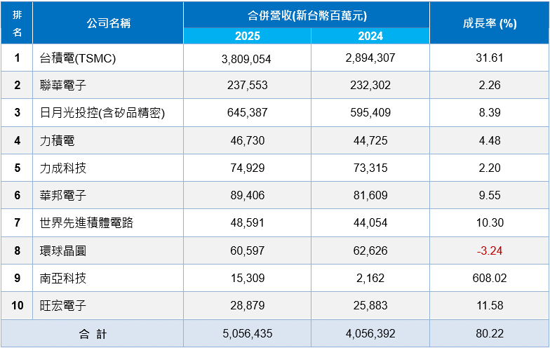據《表二》資料顯示,近五年曾入榜半導體前十大廠商之公開發行以上公司,除了環球晶圓,2025年合併營收皆較前一年度同期成長,且以上公司合計營收亦較前一年度平均成長80.22%。