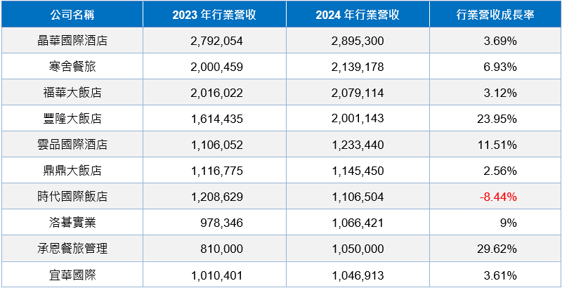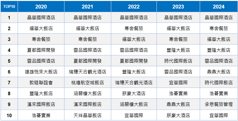 依近五年旅館業TOP10業者排名情況觀察,「晶華國際酒店」、「寒舍餐旅」及「福華大飯店」三家業者長期穩居產業前三寶座,惟各年度間「寒舍餐旅」、「福華大飯店」之名次有多次獲換。至於產業4至10名之排名變動情況則相對較大,「豐隆大飯店」受惠於近年來業績成長快速,帶動名次逐步攀升,2023、2024年躍居產業第4名;「雲品國際酒店」近年排名則多於第4至6名間徘徊,表現尚稱穩定。另「鼎鼎大飯店」、「時代國際飯店」、「承恩餐旅管理」及「宜華國際」等則為近年新入榜之業者,其中主導新竹豐邑喜來登大飯店(Sheraton Hsinchu Hotel)發展之「承恩餐旅管理」,由於2024年營收成長幅度將近30%,居TOP10業者之冠,故於當年度成功躍入前10名之列。至於旅館業TOP10業者2024年營收普遍優於2023年,僅「時代國際飯店」營收出現下滑。