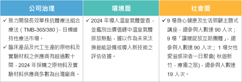 為愛滋患者提供更高效、便捷的治療方案,從而提升他們的生活品質,中裕新藥正開發TMB-365/380 合併療法,結合全抗體的長效型注射技術,旨在將用藥頻率降低至少至每二個月一次,從而大幅減輕患者負擔;另重視水資源管理、衛教宣傳攜手外部協會倡議,透過公衛領域持續付出,爭取股東和利害關係人永續信任和支持。
