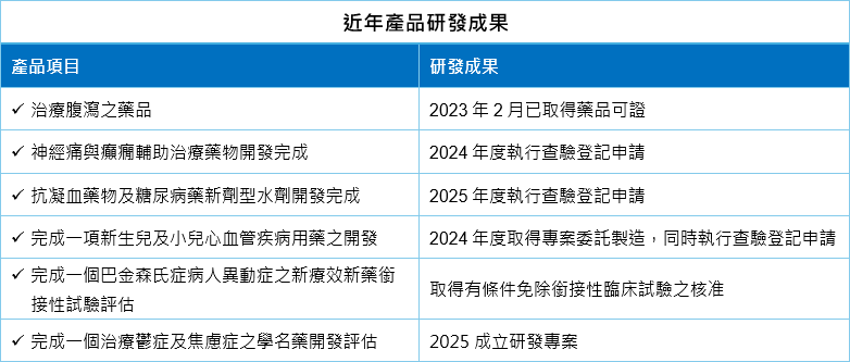 晟德大藥廠積極參與政府力推「新優化兒童醫療照顧計畫」,獲准專案委託製造小兒心衰竭用藥, 榮獲頒獎表揚,以水劑起家的晟德公司,兒科水劑在台灣市占率高達7成,面對少子女化衝擊,發揮兒科用藥研發專業優勢,協助醫師用藥陪伴兒童健康成長;獲准專案委託製造之「心寧寶 Cen-Capto」,為小兒心衰竭用藥,此水劑型藥品依病童體重精準給藥,改善症狀滿足兒科族群精準醫療需求並提高小兒用藥安全。此外,近年研發產品項目擴及神經輔助治療藥物、抗凝血藥物等水劑開發,在研發費用的投入下,包含巴金森氏症、鬱症及焦慮症學名藥正進行試驗及開發評估(參見下表)。