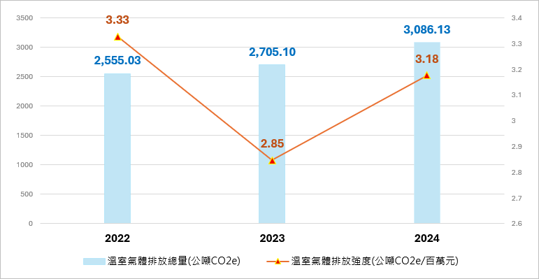 晟德配合「上市櫃公司永續發展路徑圖」,訂定2024年為溫室氣體盤查基準年,2025年完成盤查報告,並依據報告數據規劃減碳目標及策略,其排放之溫室氣體種類主要有二氧化碳(CO2)、甲烷(CH4)、氧化亞氮(N2O)及氫氟碳化物(HFCs)共四類,無排放會破壞臭氧層的物質、氮氧化物、硫氧化物及其他重大氣體排放。自2022年溫室氣體排放總量儘管逐步上升,但排放強度放緩(見下圖),同時近年用電度數並無顯著增加,維持一定用電水準,遵循法規要求,逐步落實溫室氣體盤查。