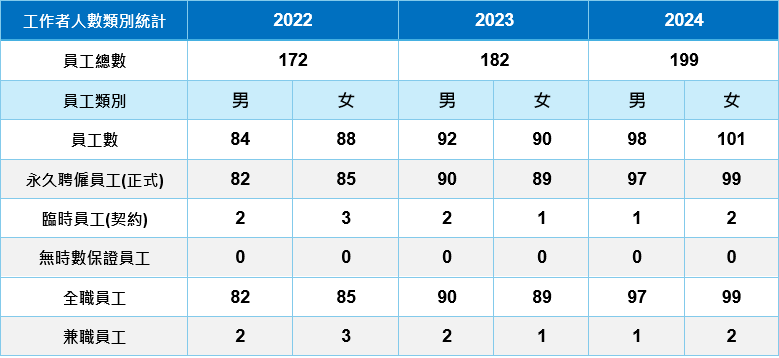 據2024年底統計,晟德全體員工人數總計共199人,其中男性員工占約49.49%、女性員工50.51%,女性主管(主任含以上)平均占比為73.68%,落實友善多元職場,打造各性別安心工作環境,實現男女擁有同工同酬獎酬條件及平等晉升機會,維持男女主管職位人數平均水平。主管職佔38人(19.39%),非主管職則有158人(80.61%),臨時員工共3名,員工組成年齡層平均為42.02歲。